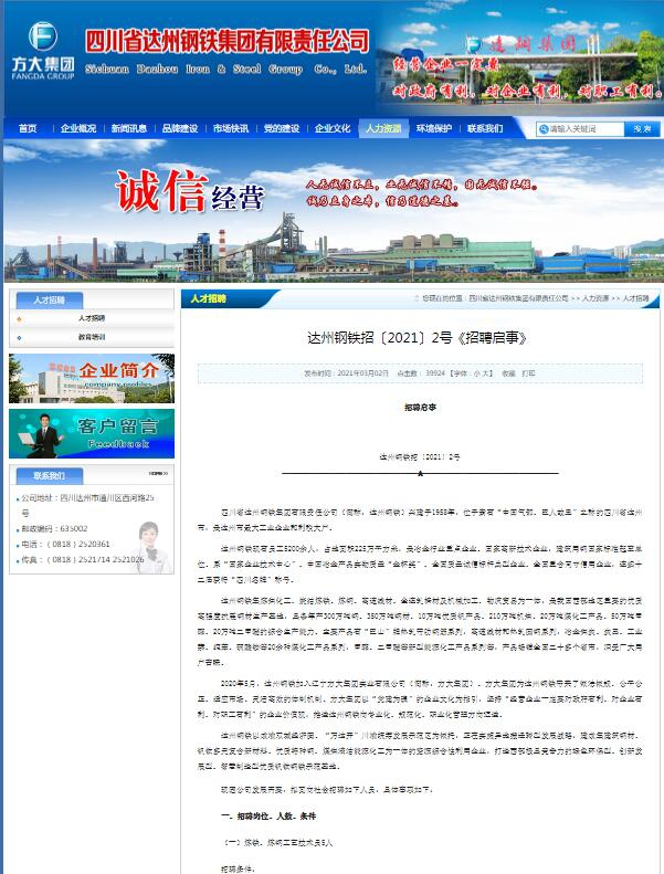 我司在招聘過程中不收取報名費、中介費、手續(xù)費、資料費等任何費用,達州鋼鐵官網(wǎng)發(fā)布的招聘啟事為本次招聘的唯一宣傳資料,請應(yīng)聘者注意識別,謹防受騙。對于發(fā)布虛假招聘信息或在招聘中牟取任何利益的個人或機構(gòu),我公司保留追究法律責(zé)任的權(quán)利,招聘舉報電話:19511804325。